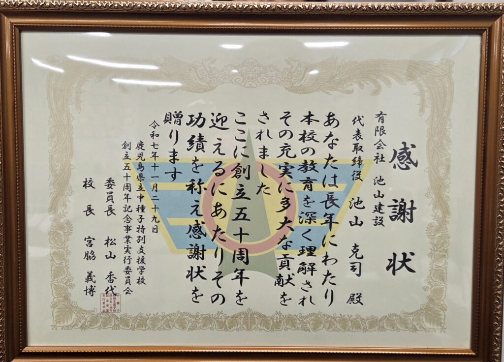 11月29日にて中種子特別支援学校の50周年記念式典にて10年以上にわたるボランティア活動に対して、感謝状を授与していただきました。